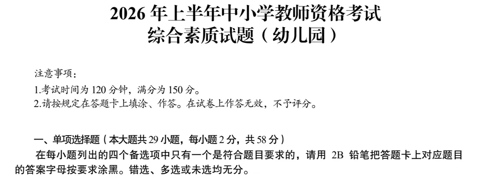 2026上教资笔试(幼儿园)科目一《综合素质》真题试卷和参考答案