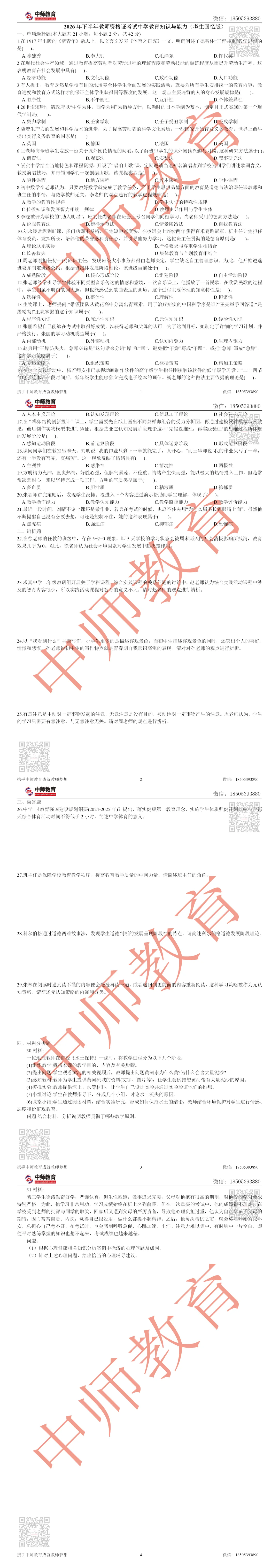 【教资】2026上半年教资笔试真题+答案 完整版 已出(快来对答案!!!)
