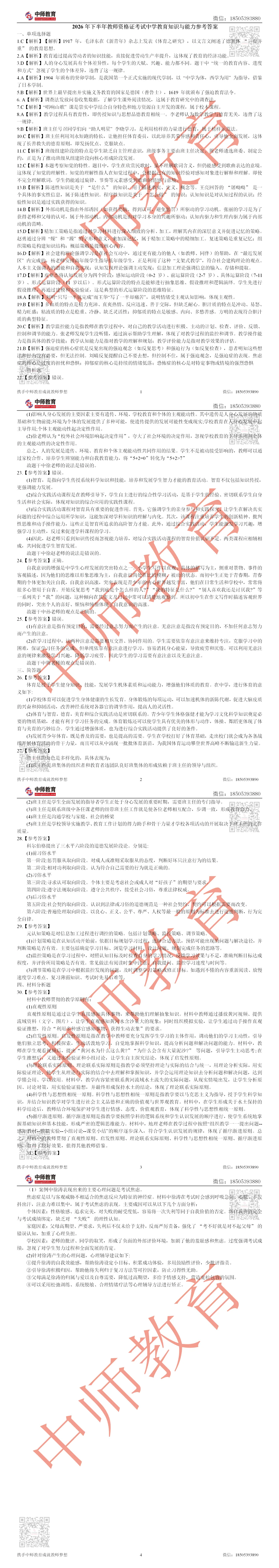 【中学】2026上教资笔试真题答案解析