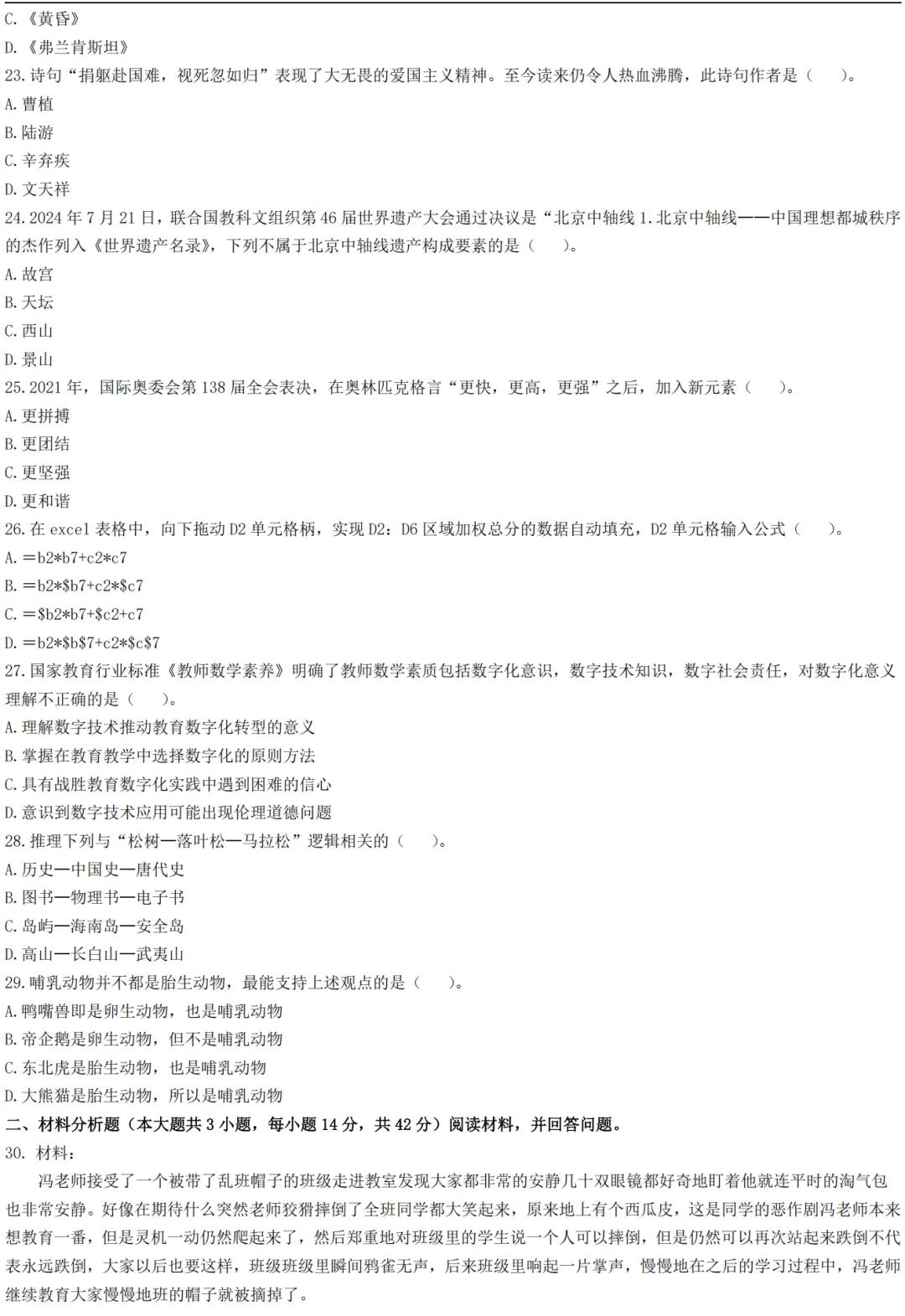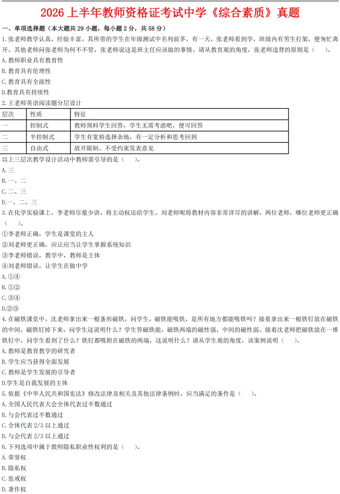 2026年上半年教资笔试真题试卷及参考答案