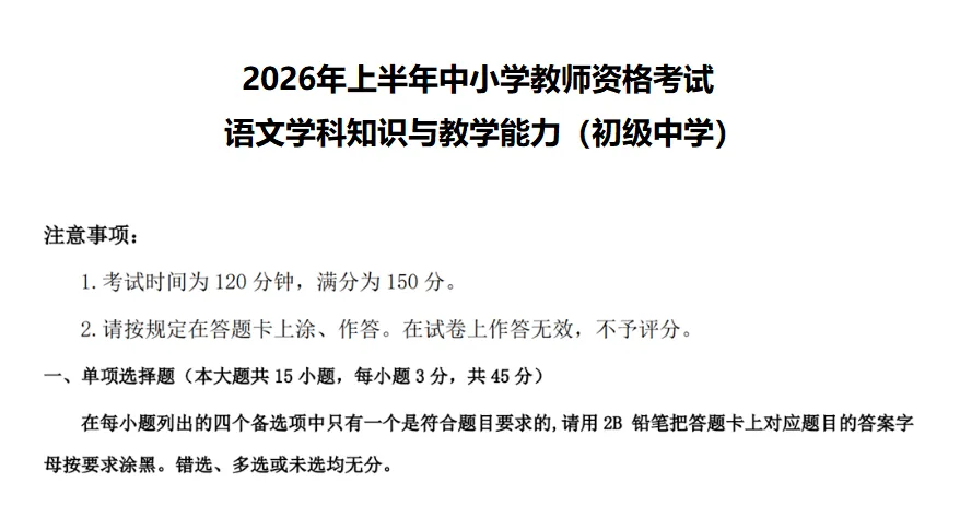 2026上教资笔试(初中高中)科目三真题试卷和参考答案