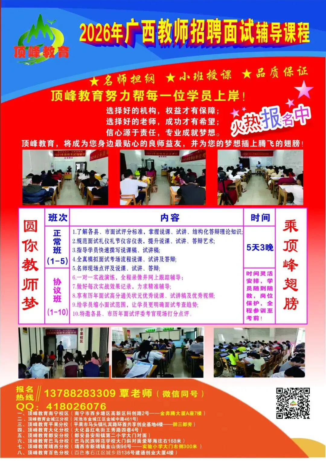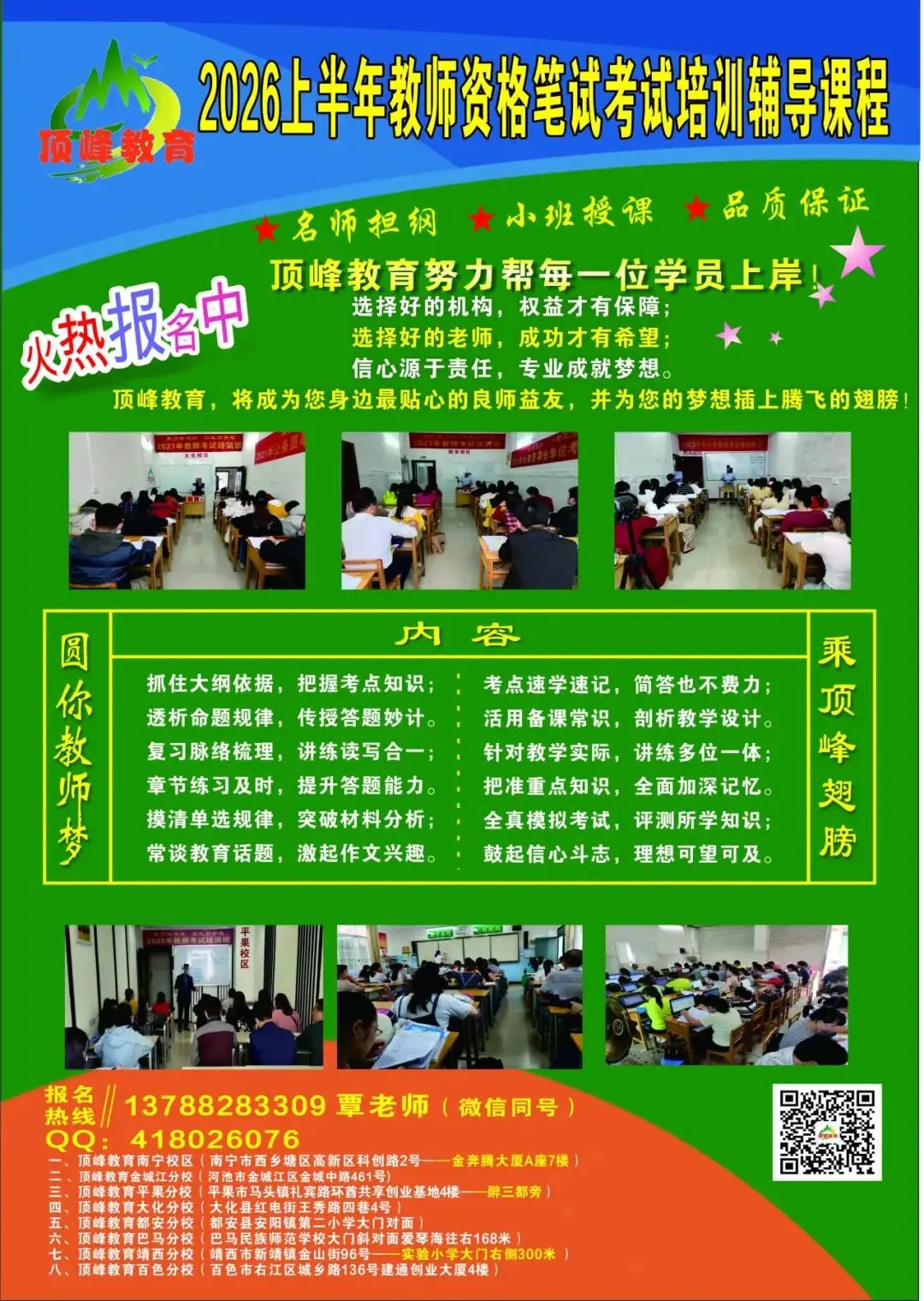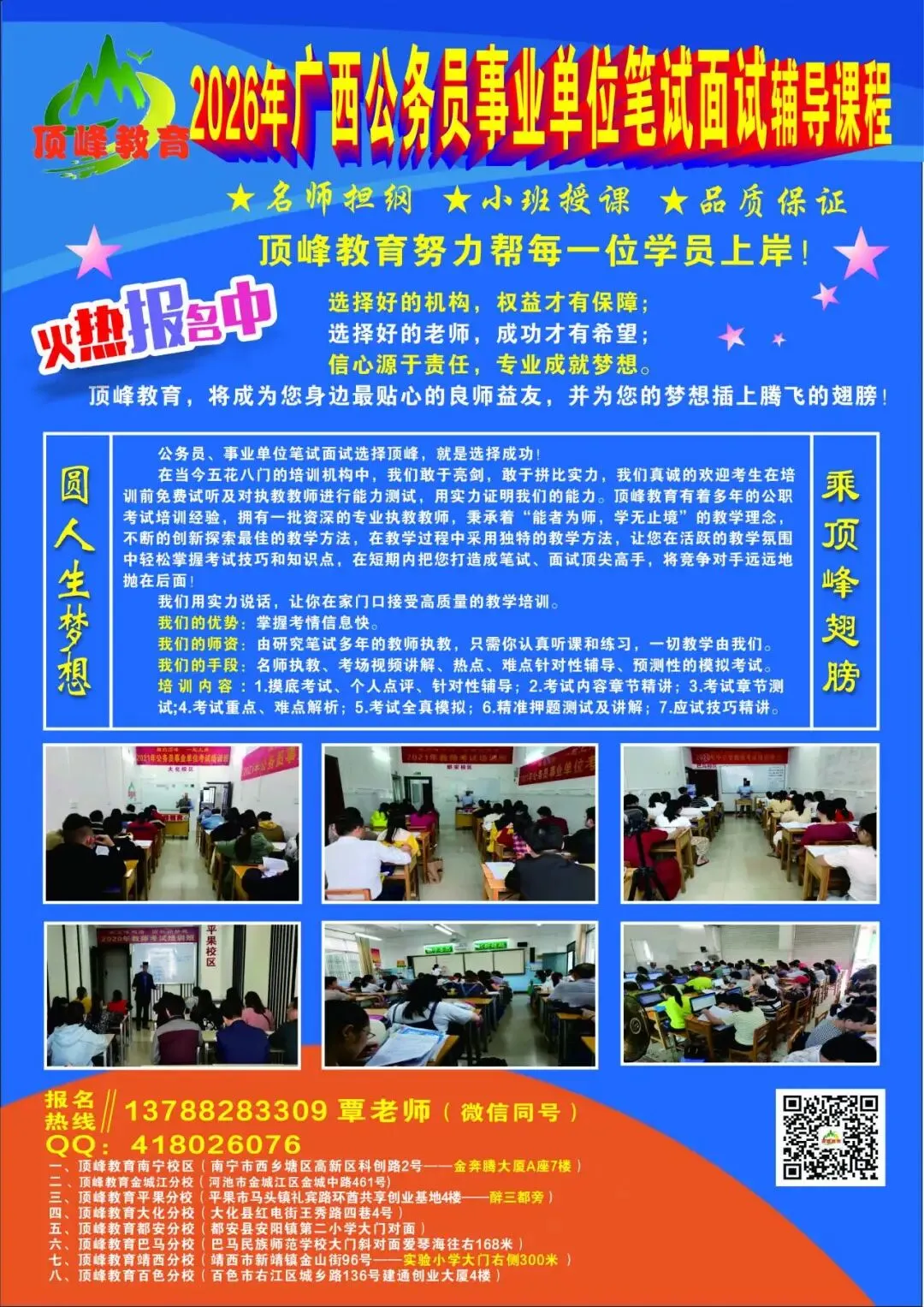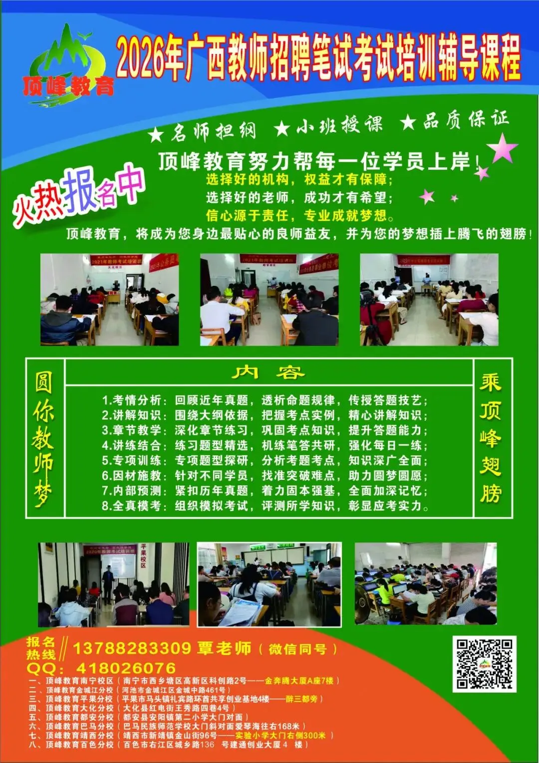 关注以下广西顶峰公众号,第一时间获取最新招聘信息,你想要的,我们都有.......欢迎扫码加入老师微信号或qq号,免费提供报名指导等服务!顶峰教育各校区培训剪影: