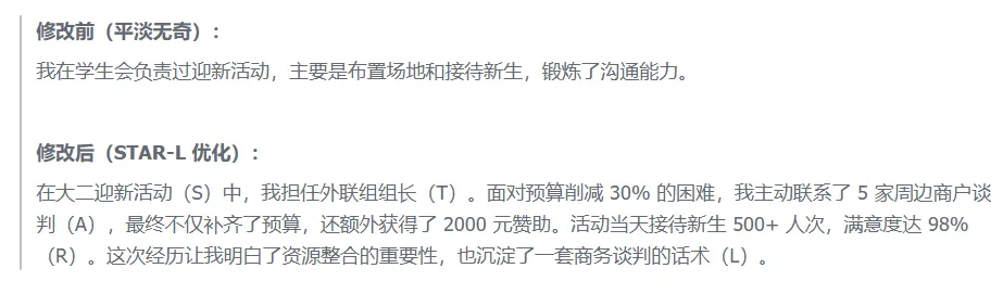 比如,JD要求“沟通能力强”,你就对应“我在学生会当干事时,负责协调3个部门举办了XX活动。