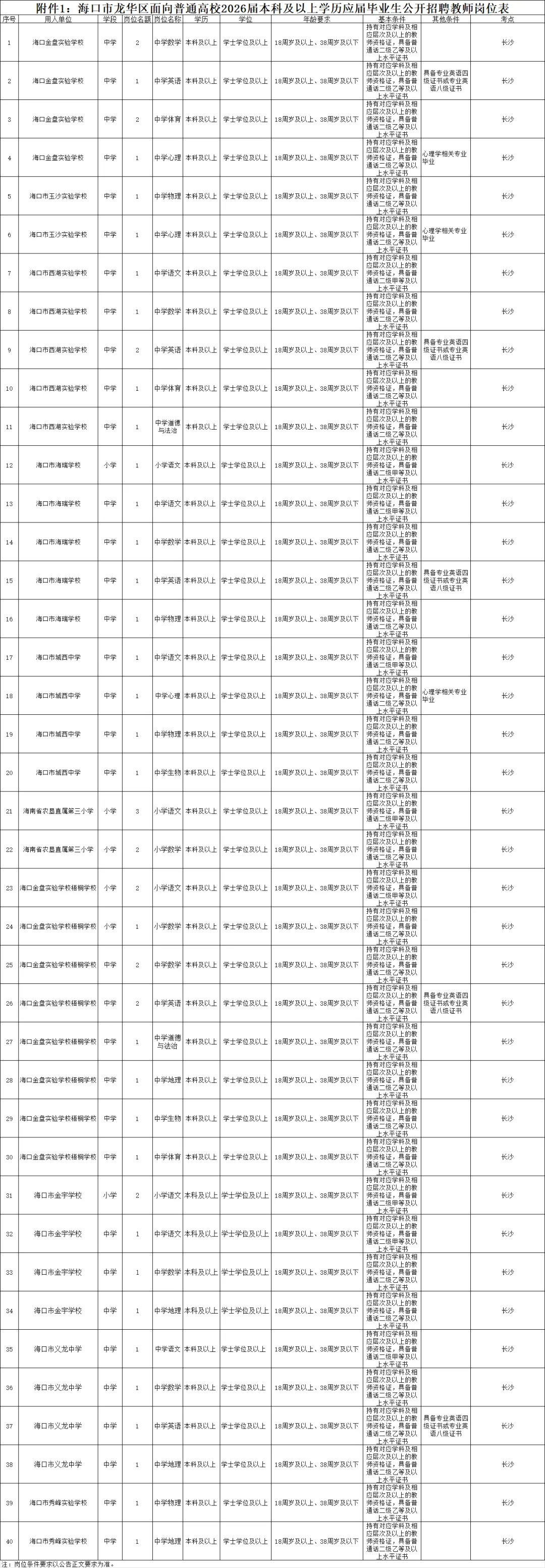 1.海口市龙华区面向普通高校2026届本科及以上学历应届毕业生公开招聘教师岗位表