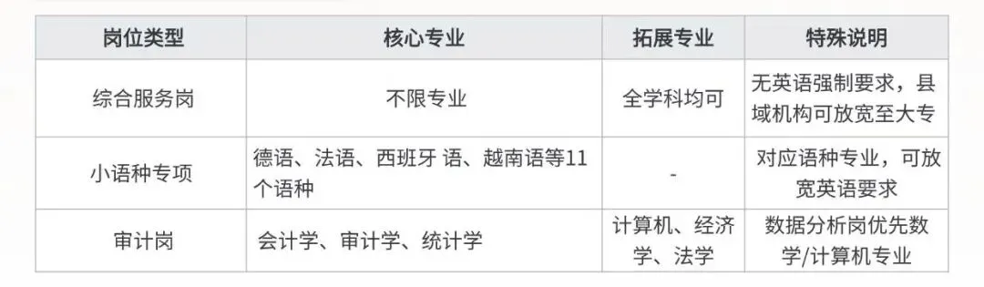 1. 英语门槛放宽:本次招聘中,综合服务岗不设置四六级英语成绩要求,为英语成绩未达标的考生提供了宝贵的报考机会。