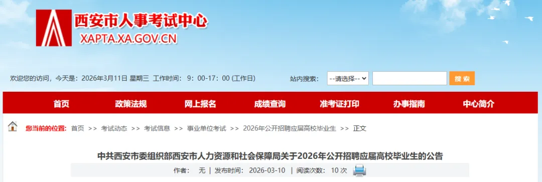 本次招聘在西安人事考试网(xapta.xa.gov.cn)发布公告。