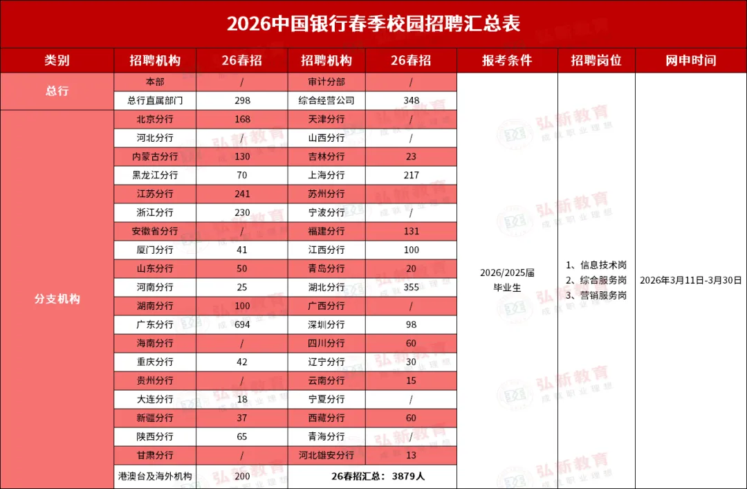• 招聘范围:境内外院校应届毕业生(毕业时间要求在2025年1月1日至2026年7月31日期间)。 • 报名时间:3月11日至3月31日。 • 报名渠道:需通过中国银行春季招聘官方网站进行。 |