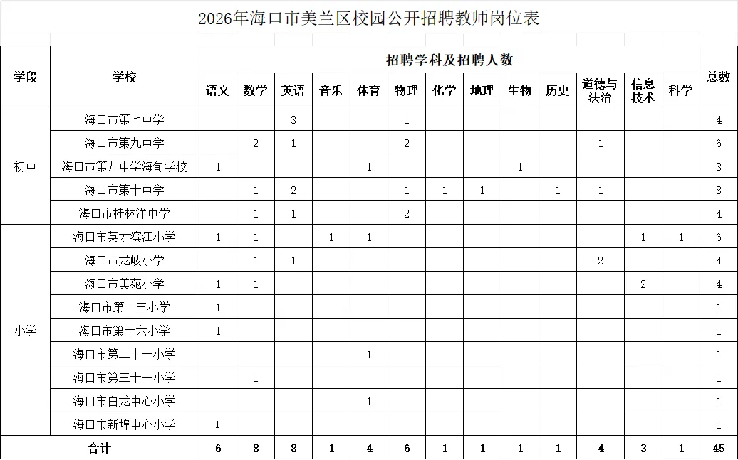 2026年海口市美兰区校园公开招聘教师45名,具体岗位详见《2026年海口市美兰区校园公开招聘教师岗位表》(附件1)。
