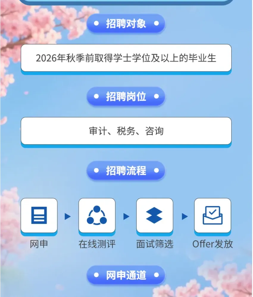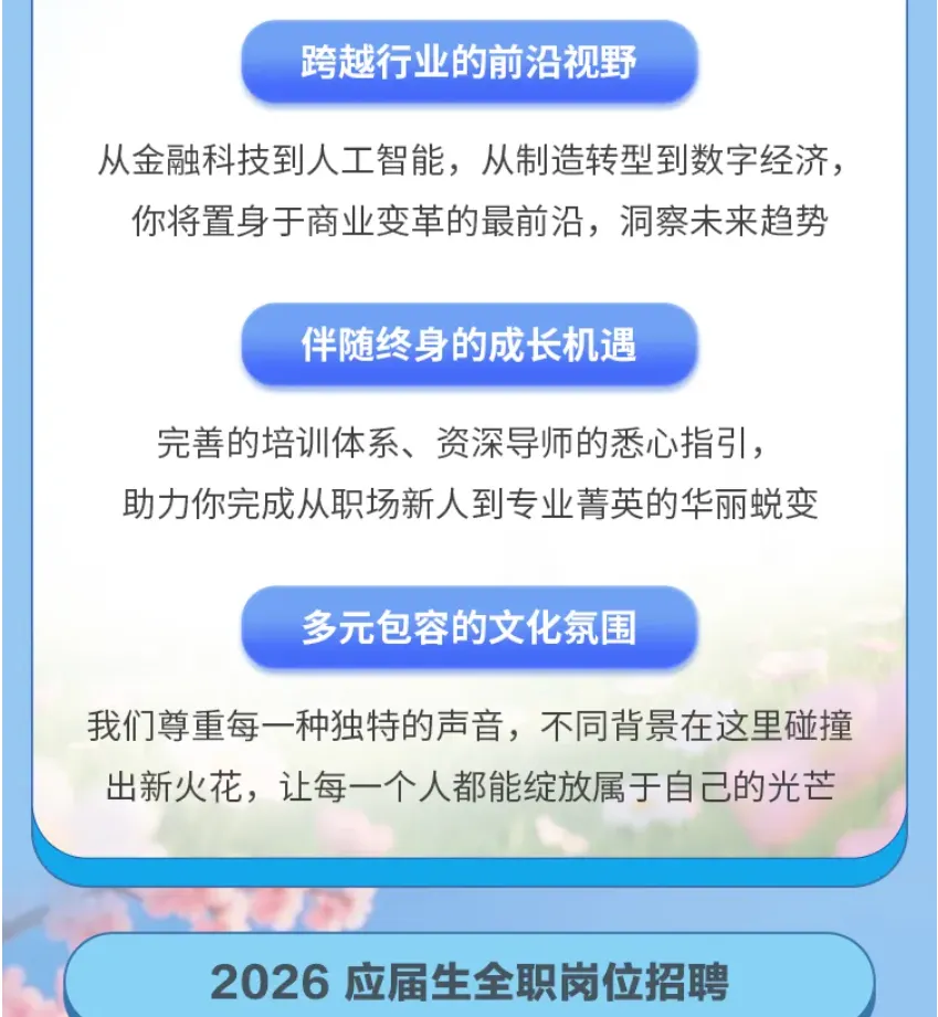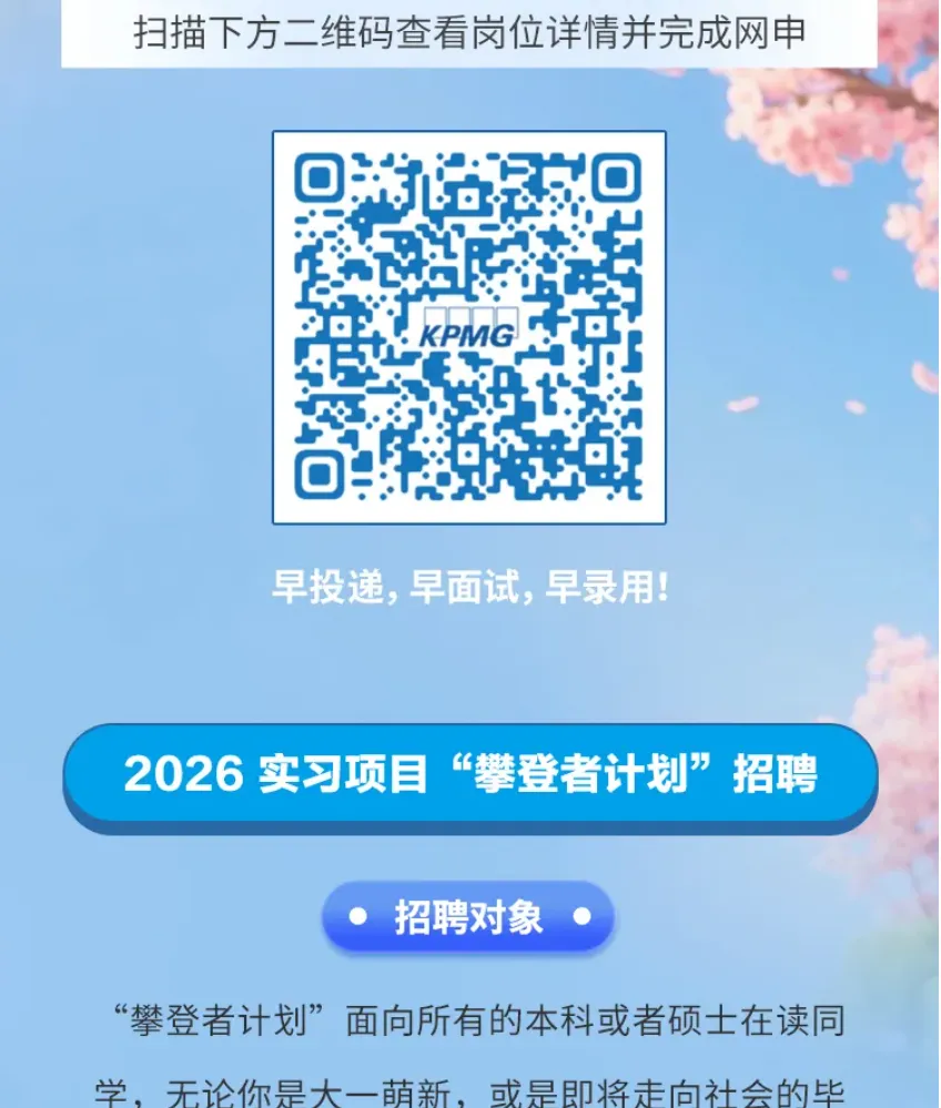 毕马威(KPMG)成立于1897年,总部位于荷兰阿姆斯特丹,是全球“四大”会计师事务所之一,业务遍布143个国家,在中国设有31个办事机构,拥有超1.5万名员工,长期在审计、税务及咨询领域占据行业领导地位。其就业前景广阔,作为财会与咨询界的“黄埔军校”,毕马威提供清晰透明的晋升机制和系统化培训,尤其适合应届生积累高含金量项目经验,是通往名企财务高管或咨询精英的黄金跳板。待遇方面,2025-2026届应届生起薪约1.25万元/月,实习生日薪可观,且福利体系完善。注意事项包括:工作强度大,忙季加班频繁,需具备极强的抗压能力和时间管理技巧;招聘流程严格,网申通常仅一次机会且限投一个岗位,建议提前准备英语及案例分析能力;此外,虽专业不限,但核心岗位仍偏好商科背景,求职者需合理规划职业路径以应对高强度的职场挑战。