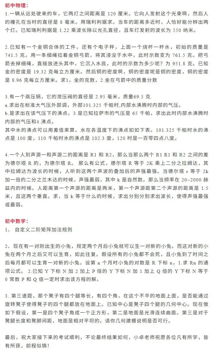 1、数学2道大题和物理4道大题,仍然没有填空题和选择题。