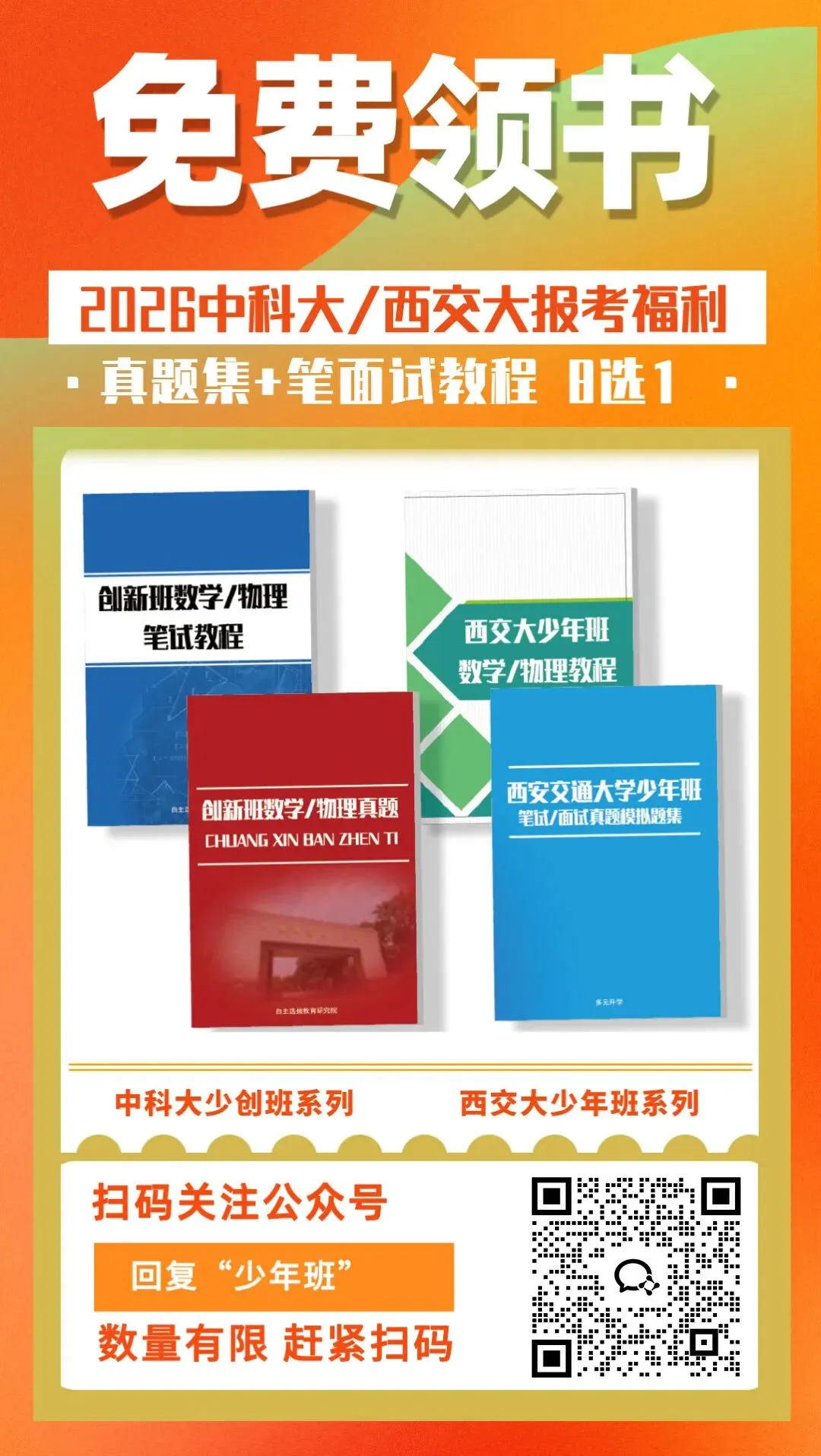 为了帮助大家更好地备考少年班,少年班信息平台特地为大家准备了一份福利!毕竟考上少年班非一蹴而就的,一定要不断学习面试真题及数理化竞赛真题才行!快来为孩子领一本冲击少年班的资料吧↓↓↓《数学/物理/化学竞赛真题集》