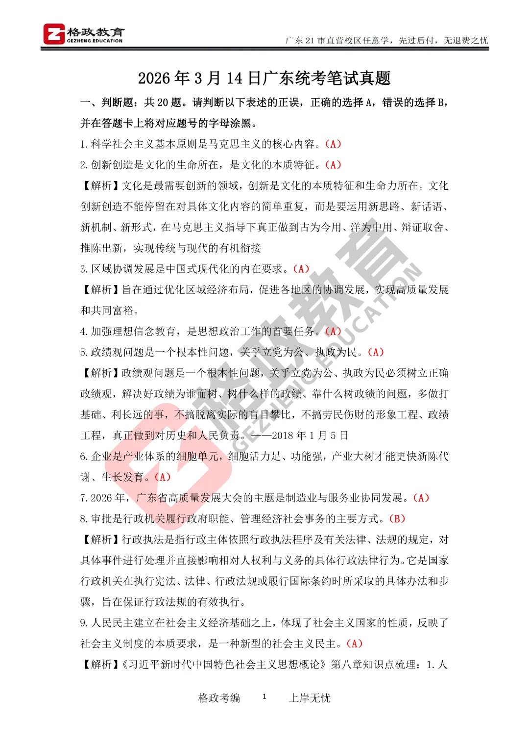 26年3月14日广东事业单位统考笔试真题(考生回忆版)对答案