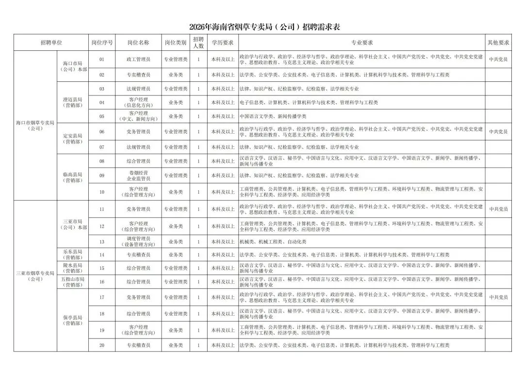 附件:1.2026年海南省烟草专卖局(公司)招聘需求表