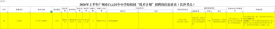 2.“百万英才汇南粤”2026年上半年广州市白云区中小学校校园“优才计划”招聘岗位需求表(长沙考点)