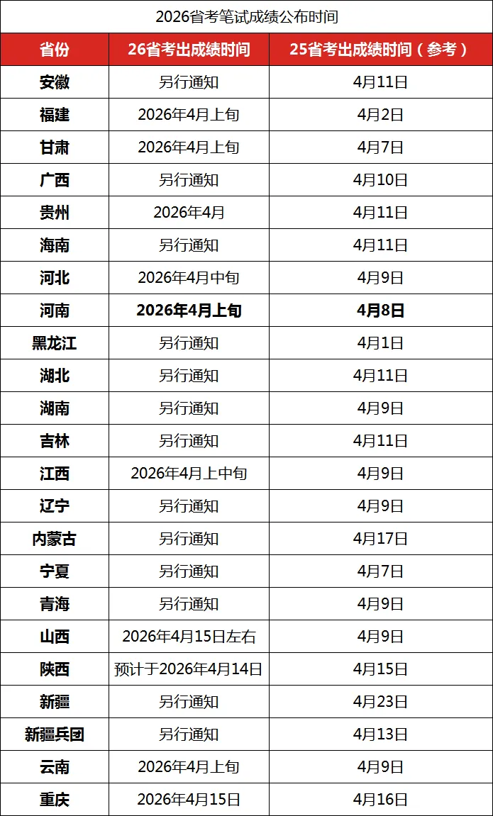 复制上方链接打开浏览器或点击下方阅读原文,登录网盘账号后,将文件转存至个人网盘,后续文件更新会自动推送提醒。黑龙江、福建省考笔试成绩发布时间较早,距离笔试结束仅半个月!今年未明确成绩公布时间,不过建议所在地区考生提前准备面试!①重庆笔试成绩将于4月15日公布,陕西省考成绩预计于4月14日统一公布,山西省考笔试成绩预计于4月15日左右公布。②甘肃、云南、河南、福建、江西五省将于4月上旬公布成绩,或是最早公布笔试成绩的一批,建议所在地区考生提前准备面试!③其余地区:笔试成绩公布时间基本集中在四月中上旬。(*以上内容仅供参考,具体发布时间请以官方通知为准。)