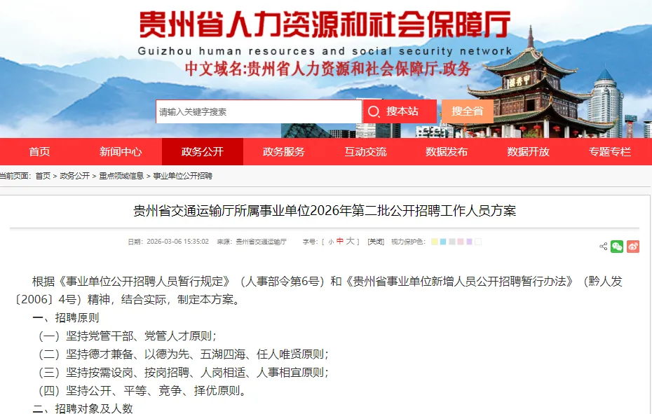 贵州省交通运输厅所属事业单位2026年第二批公开招聘工作人员方案