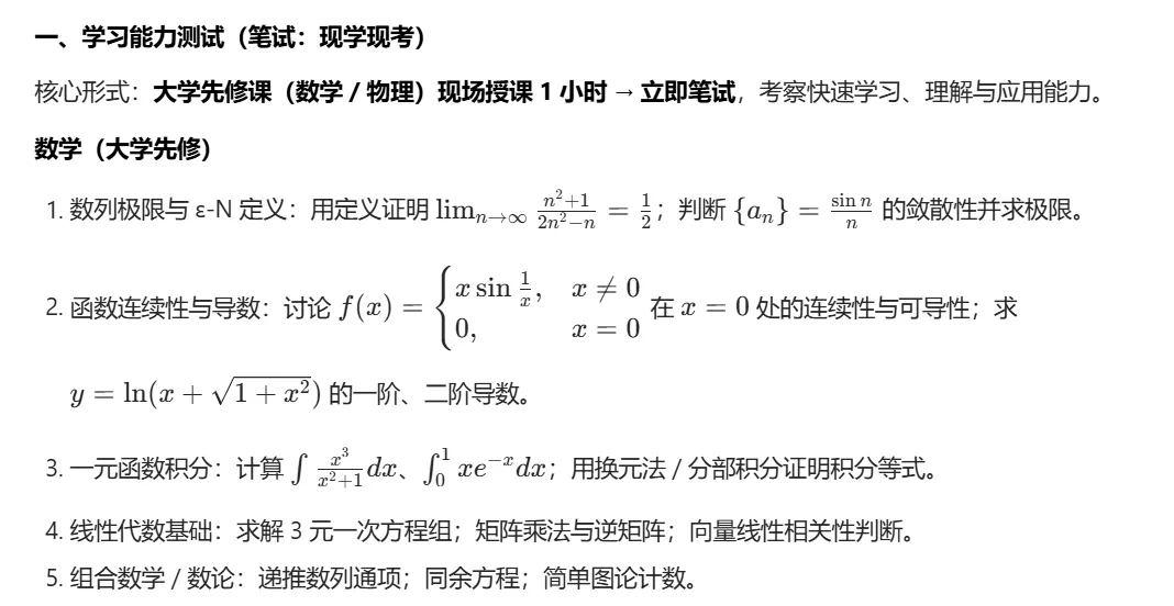 学习能力测试:提前预习大学数学(微积分、线代)、大学物理(力学、电磁学)入门内容,训练 “快速听课 + 当堂解题” 能力。