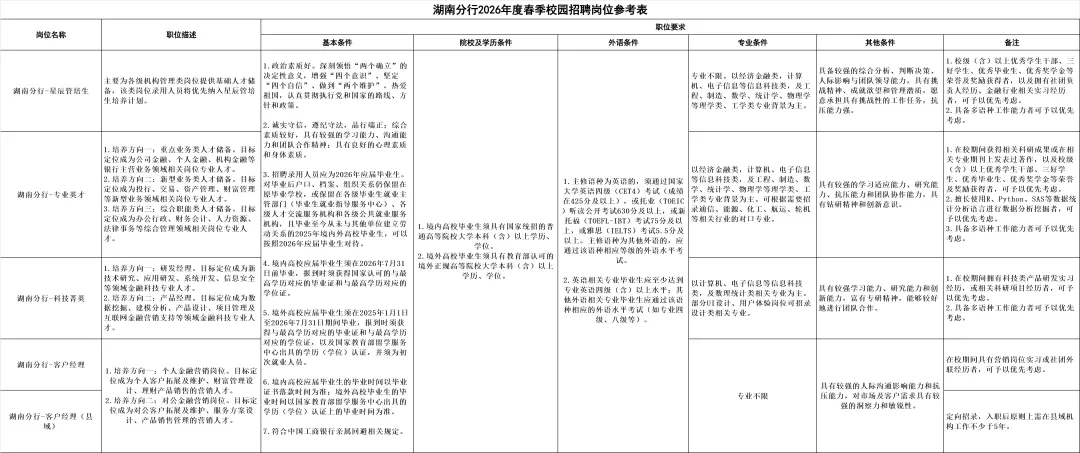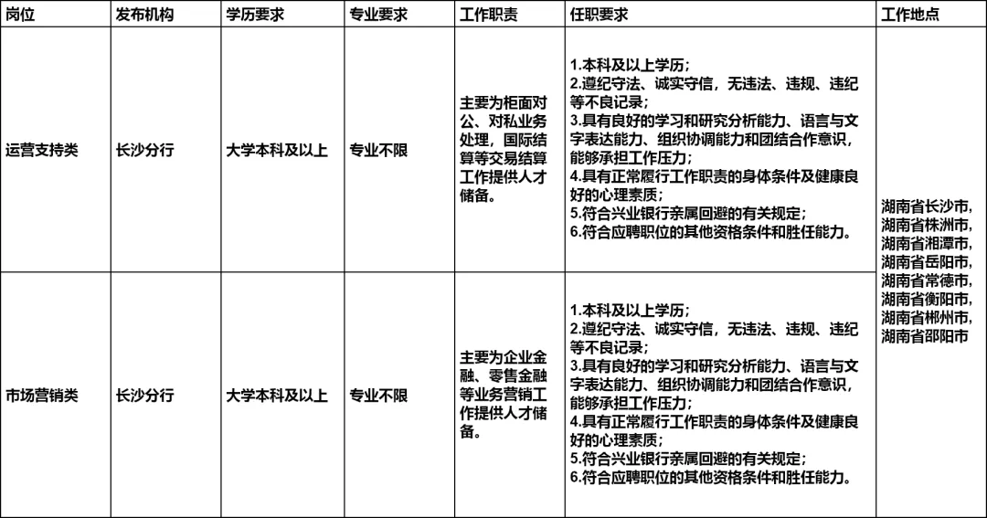 应聘人员录用后,分配到株洲、湘潭、衡阳、邵阳、岳阳、益阳、常德、永州、郴州、娄底、怀化、湘西、张家界等13家二级分行。
