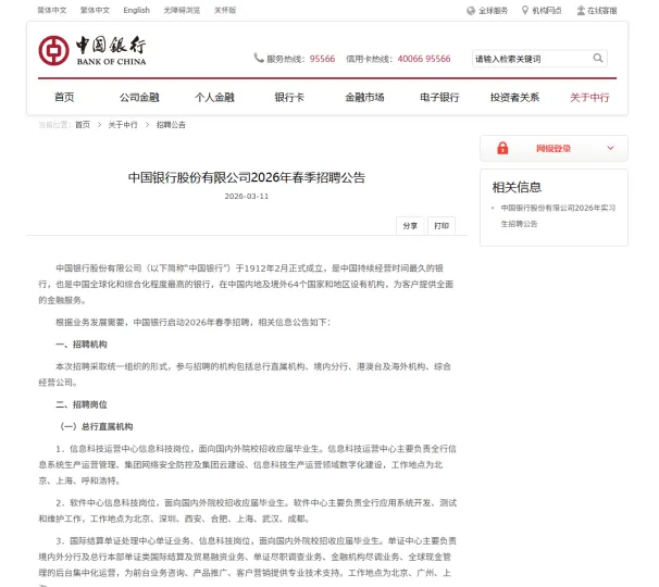 具体的招聘岗位、应聘条件,请登录中国银行春季招聘和实习生招聘网站查询。