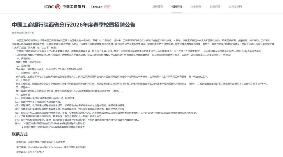 我行具体招聘岗位及条件详见《中国工商银行陕西省分行2026年度春季校园招聘岗位参考表》(附件2)。