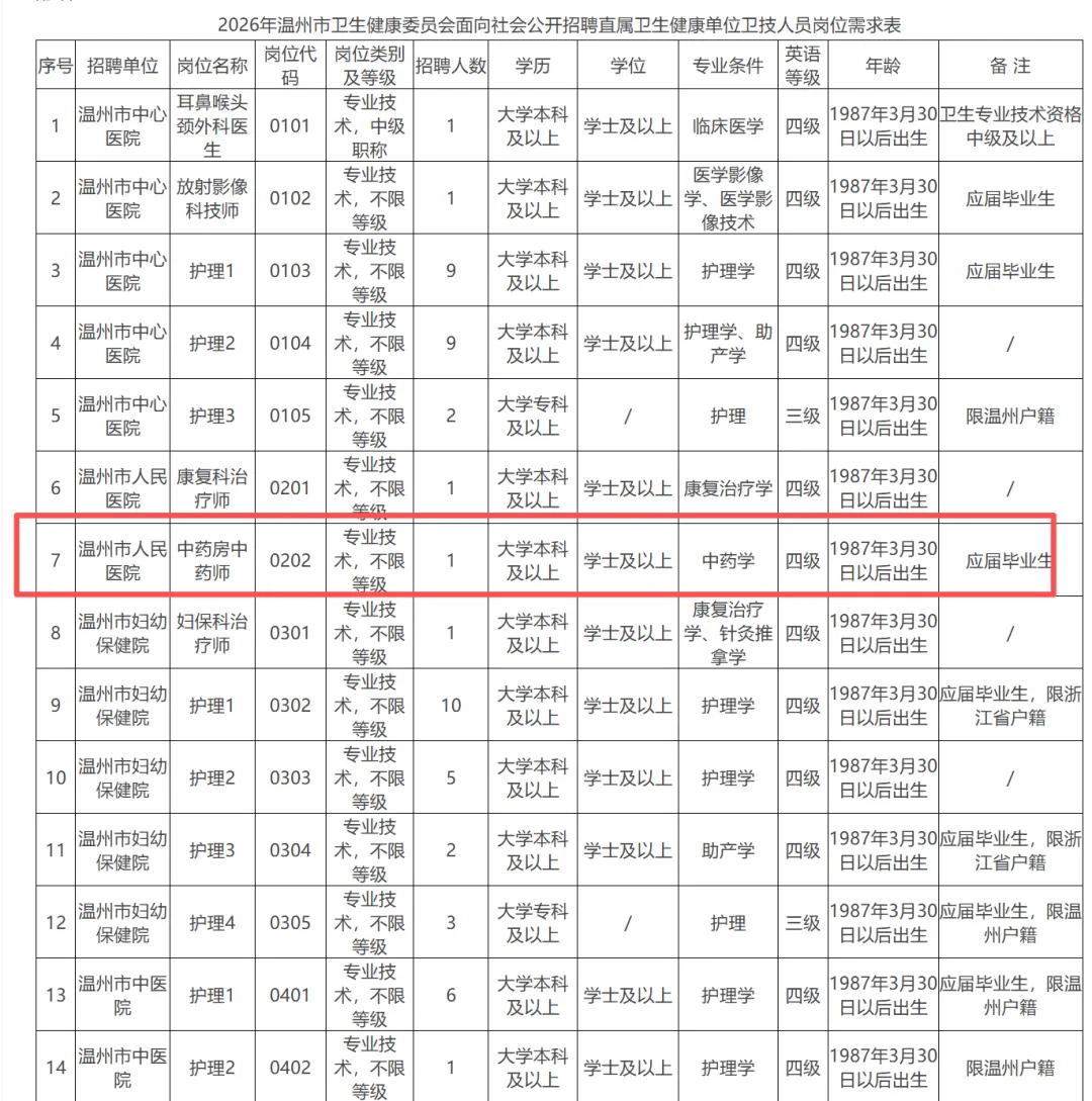 (一)报考程序 报名和资格初审通过网络方式进行。 1.报名时间:2026年3月20日8时30分—3月30日17时30分。 报考人员登录温州市卫生健康委员会网站(网址:http://wjw.wenzhou.gov.cn/)右下角“招聘考试”栏目,注册个人真实信息后,选择单位和岗位进行报名。每位报考人员限报一个岗位。仅注册不报岗位,视为无效报名。 2.资格初审时间:2026年3月23日8时30分—4月9日17时30分。 由用人单位对报考人员是否符合岗位资格条件进行资格初审。报考人员可上网查询结果及未通过初审的理由。通过资格初审的不能再报考其他岗位;未通过的可在报名时间内再次报名并接受资格初审。 资格初审后,同一岗位的报考人数与招聘计划数比例不足3:1的,将核减或取消相应招聘计划,并及时在温州市卫生健康委员会、温州市人力资源和社会保障局网站公布。 3.下载并打印《笔试准考证》 资格初审通过人员登录报名系统,下载打印《笔试准考证》。具体时间另行通知。 药学考医院就进药剂科备考精品群,群内都是志同道合的药友,群内既有药剂科笔试/面试真题,又有药剂科招聘信息!