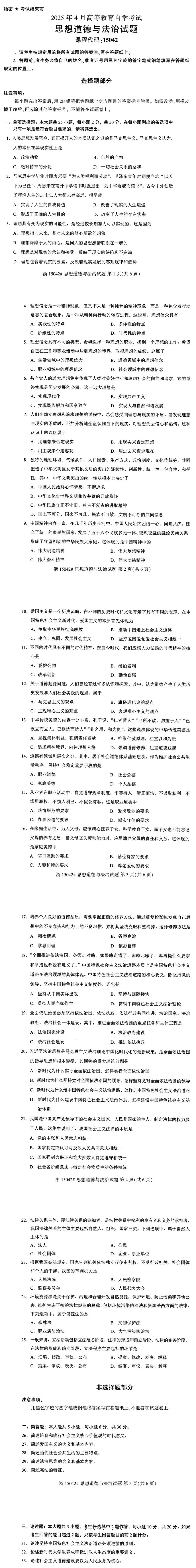 小自考笔试|| 15042思想道德与法治(2504考期真题)
