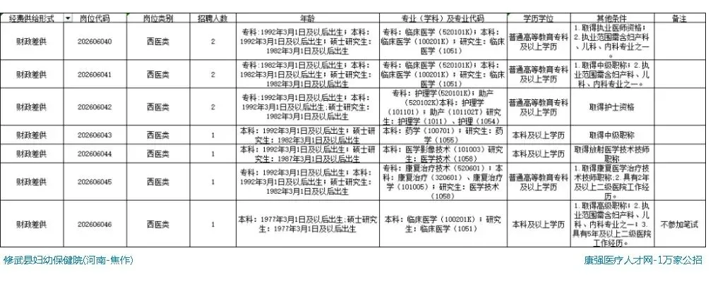 6:焦作市卫生健康系统医疗卫生机构公开招聘岗位表(修武县)