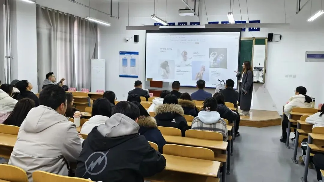 宣讲过程中,冯珍珍副总经理结合自身行业经验,以亲切生动的表述,围绕直播电商行业发展趋势、职业岗位需求及职业规划方向,引导学生精准剖析自身优势与职业潜力,明确职业定位,树立科学的就业观。同时,针对学生最关心的薪资待遇、工作环境、职业晋升通道及实习就业保障等问题,进行了详细解读,全面展示了爱朵集团的发展实力与人才培养理念,让在场学生对企业岗位需求、行业就业前景有了清晰认知。