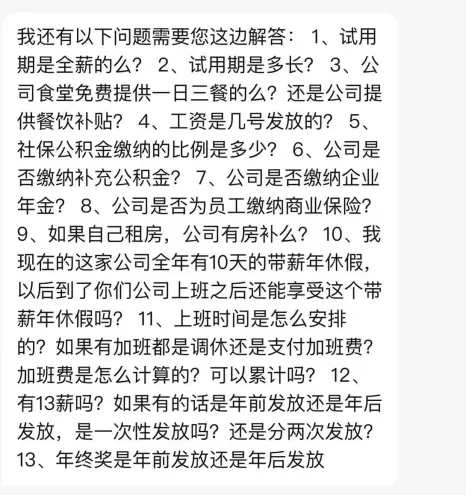 在平台沟通时,打包提问看似高效率,实则是忽略了面试逻辑。这两年某书平台上兴起的“整顿 HR 风”,提倡一次性问完所有硬性条件问题,以此快速规避所谓的“不合规”企业。然而,如果你在平台投递阶段这么做,简历很可能会“石沉大海”。因为 HR 后台,尤其是一些热门岗位,简历成百上千,他们没有必要在第一轮就和你掰扯这么多问题。