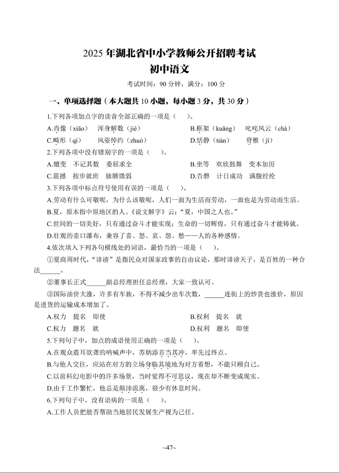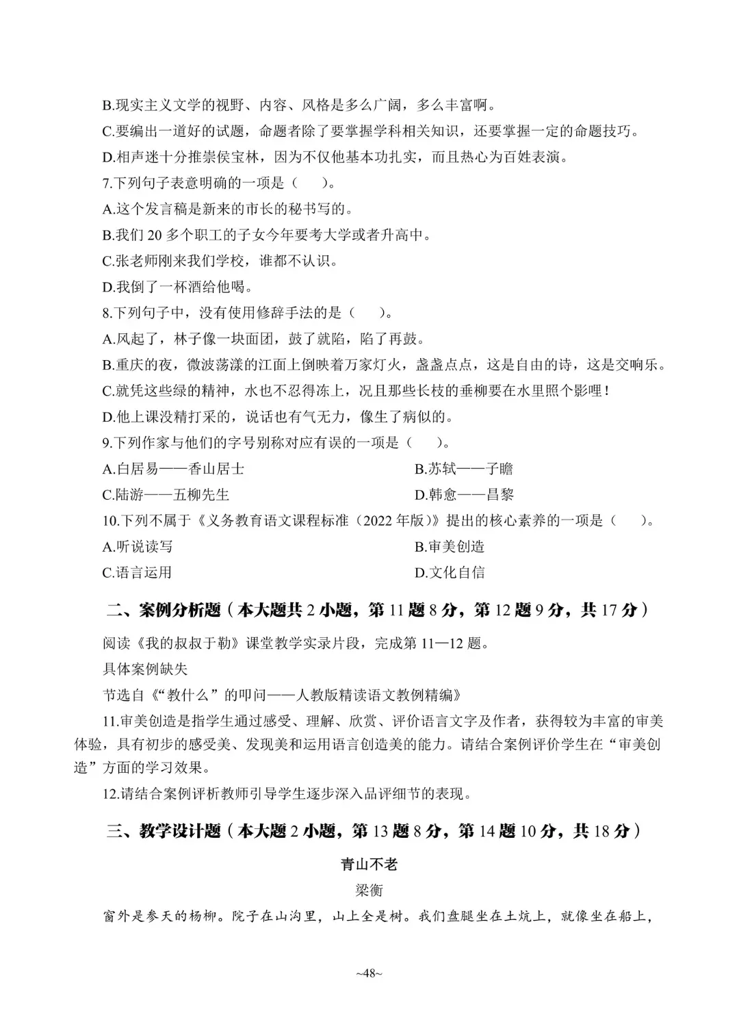 湖北语文教师招聘考试笔试真题