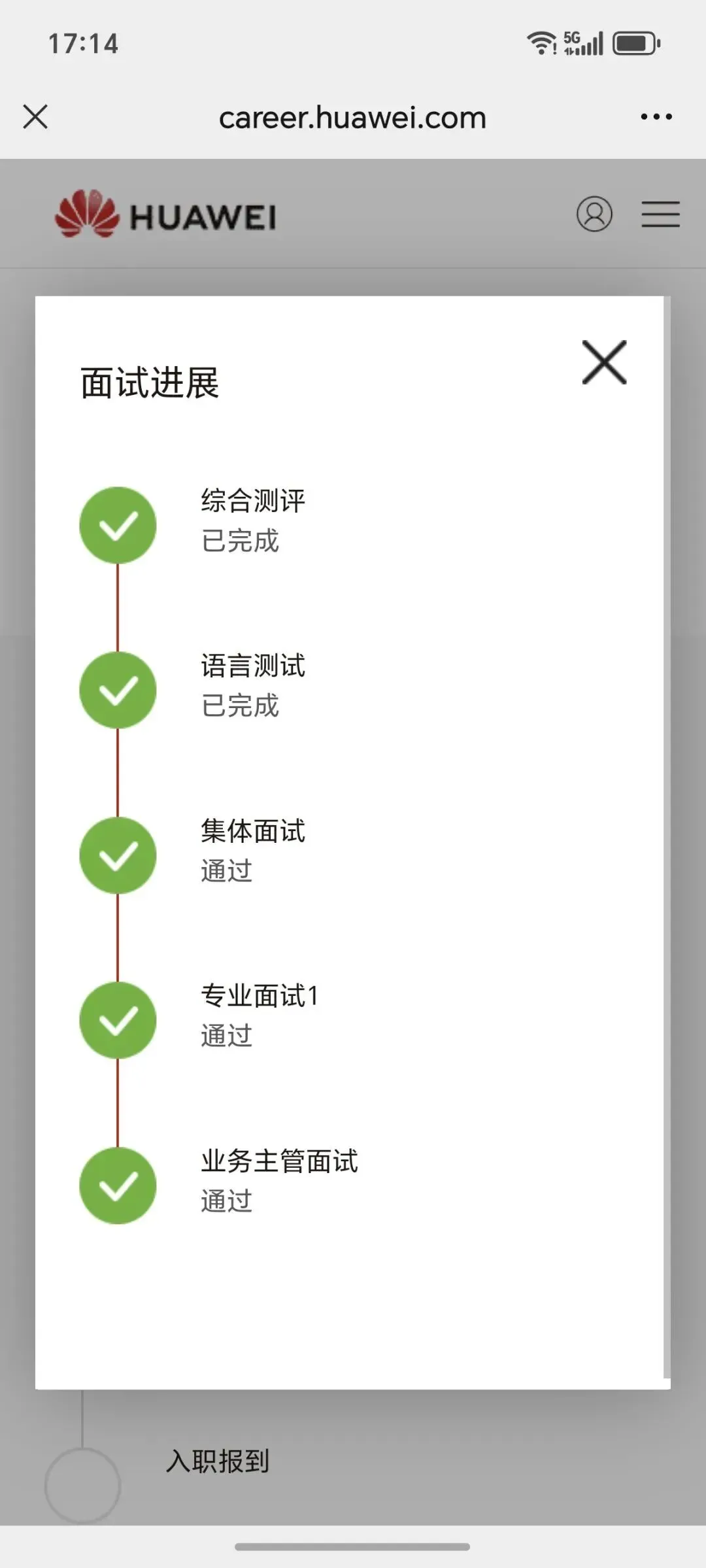 华为招聘官网,面试通过界面。