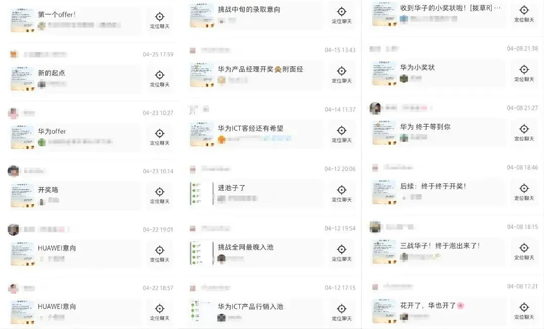 我并非个例。各大社交媒体平台每天活跃着无数个同我一样的“泡池子选手”,他们一遍一遍打开某书,一遍一遍刷新自己的首页推荐,就为了看华为春招的最新动态,看有没有新的人“进池子”,有没有新的人“开奖”。他们甚至将自己的头像、昵称、主页都换成华为相关,他们戏称自己是“华孝子”、“誓死效忠华为”,他们秉持着“爱信等”(爱华为、信华为、等华为),他们在每一个开奖的贴子评论区下刷“接好运”,他们还建了一个“华为春招开奖群”,几百号人活跃在群里,只要有人收到录用通知,就立即分享到群里。他们等待,他们焦虑,他们不安,但他们仍然互相鼓励、互相安慰。然而他们中大部分人,经历的都只是“逢场作戏”、“黄粱一梦”。我也在群里,我是他们中的一员。