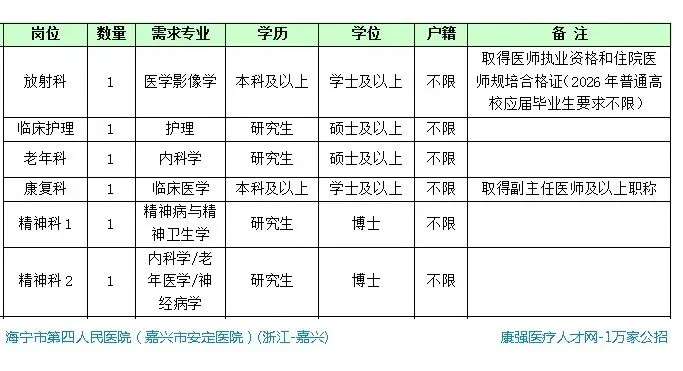 为加强卫技人才队伍建设,根据《海宁市人民政府办公室印发关于事业单位分类组织公开招聘实施意见的通知》(海政办发〔2014〕124号)、《海宁市事业单位公开招聘工作人员实施细则》(海人社〔2015〕49号)、《海宁市2025-2026年度事业单位人才紧缺岗位和高层次急需人才目录》(海人社〔2025〕29号)、《嘉兴市县域医共体医疗卫生人才“县乡村一体化”管理改革试点扩面工作方案》(嘉卫〔2025〕129号)等文件精神,现就海宁市卫生健康系统2026年3月赴苏州大学苏州医学院公开招聘事业单位卫技人员具体事项公告如下: