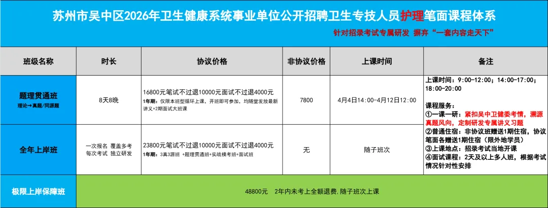 针对苏州吴中区卫健委考试特点,我们推出“吴中区笔试专项班及护理笔面专项班”,助你精准突围: