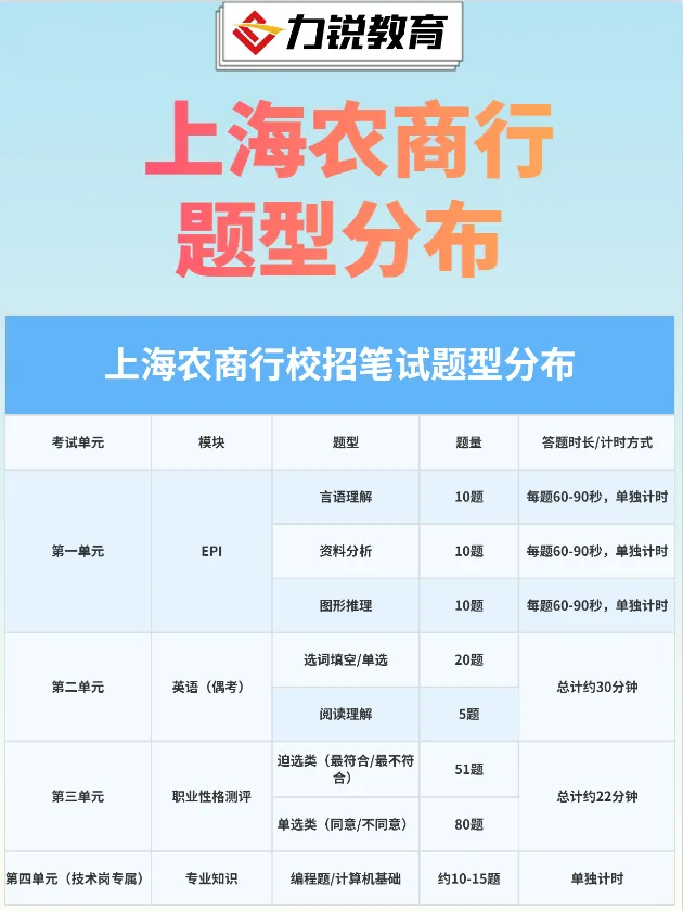 上海农商行行笔试内容一般是:EPI、英语、职业性格测评等以下是题量分布大家可以参考一下哦
