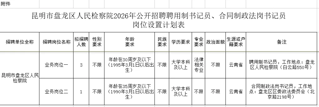 招聘聘用制书记员、合同制政法岗书记员共4名,岗位设置详见《昆明市盘龙区人民检察院2026年公开招聘聘用制书记员、合同制政法岗书记员岗位设置计划表》(详见附件,以下简称《设置表》)。