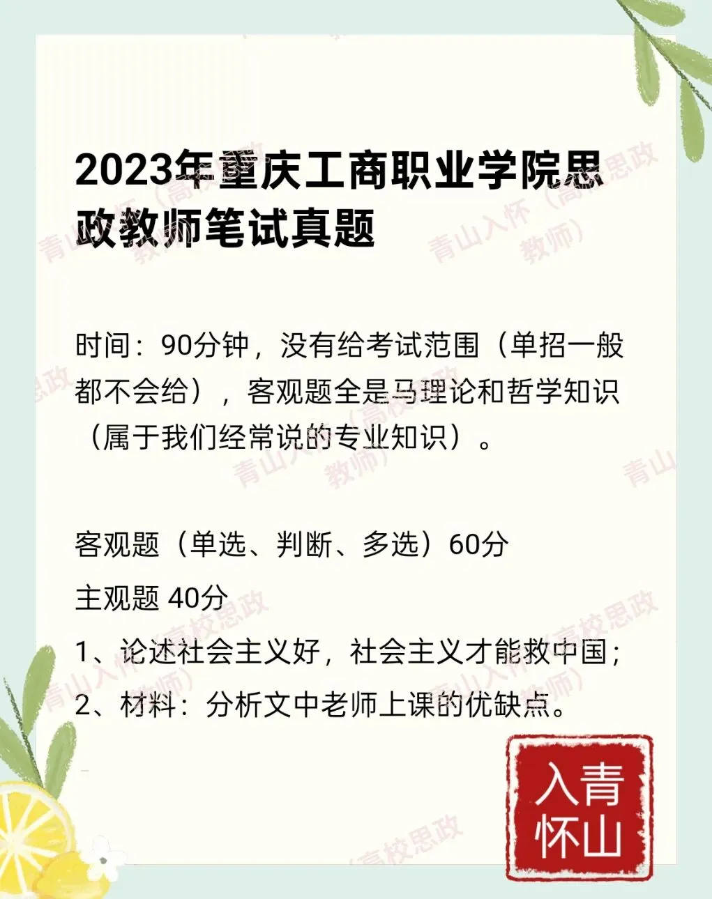 >2023年重庆工商职业学院思政教师笔试真题