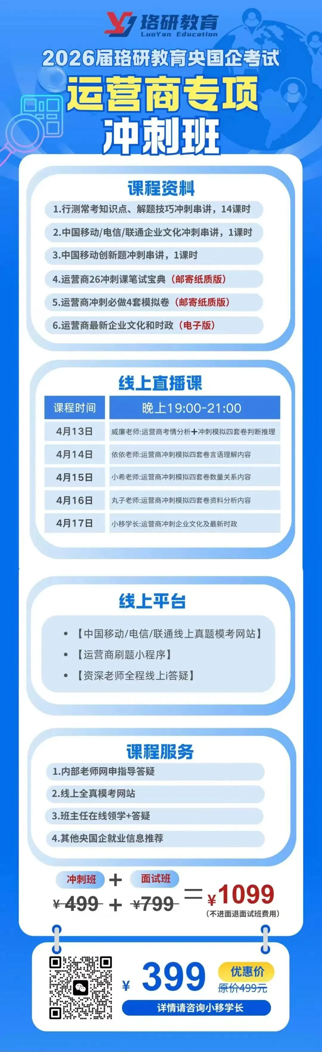 转发活动海报至朋友圈/QQ空间(不分组保留1h),关注公众号[珞研运营招】可 免费参与运营商千人模考(主要针对中国移动全题型模考),扫码加入模考群(QQ群:1032548568),添加群管理员(头像带有珞研标识),发送截图即可免费获得模考邀请码!