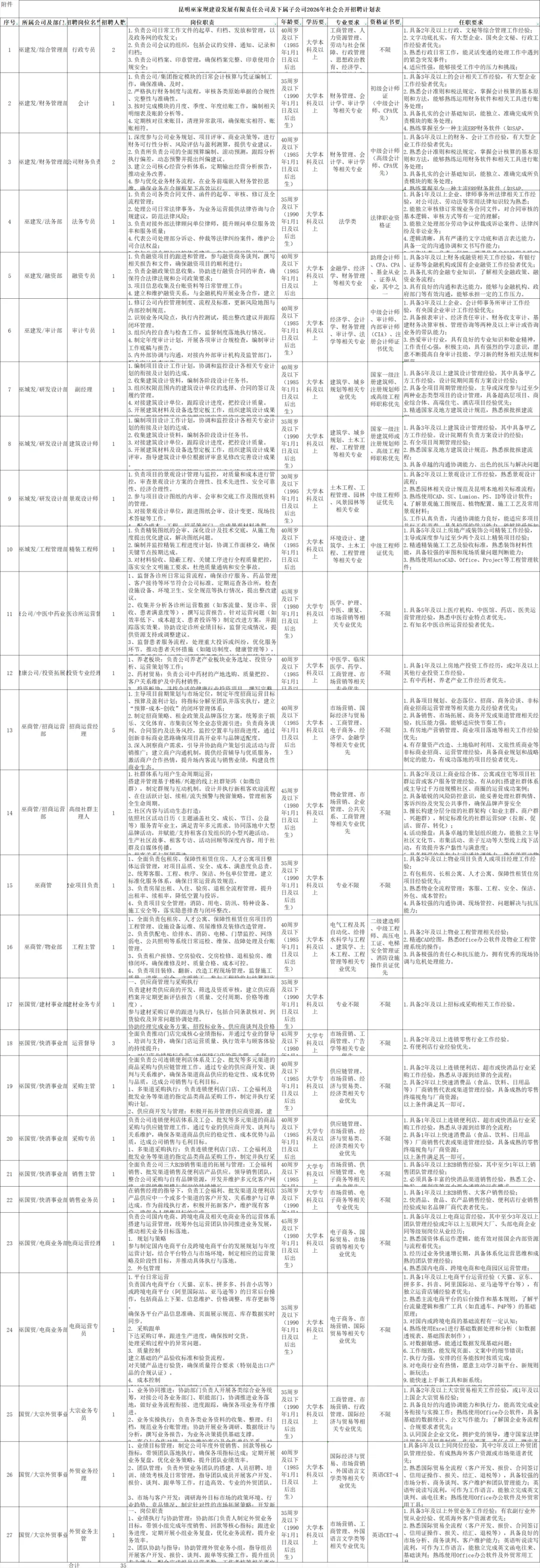 具体招聘岗位、岗位资格条件等信息详见附件:《昆明巫家坝建设发展有限责任公司2026年社会公开招聘计划表》。