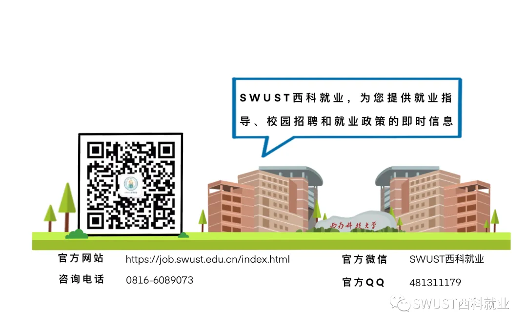 了解最新校园招聘、就业政策等信息,可通过西南科技大学就业信息网“工作通知”、“校招公告”和“宣讲会”等查看。同时可通过校园LED屏(107广场、七彩柱广场);【微信公众号】:“西南科技大学就业”获取最新的招聘信息时间。西南科技大学就业办官Q:481311179了解最新校园招聘信息。