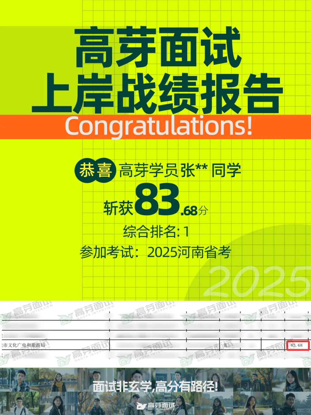 15天面试成功上岸!高芽学员张**同学,面试83.68分斩获三门峡市级文旅局岗位!