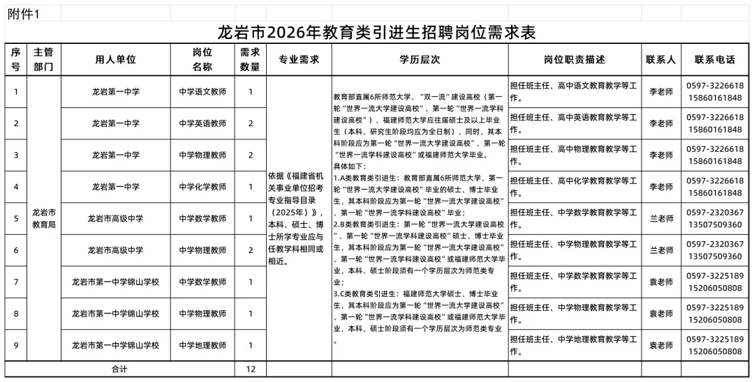 1.龙岩市2026年教育类引进生招聘岗位需求表