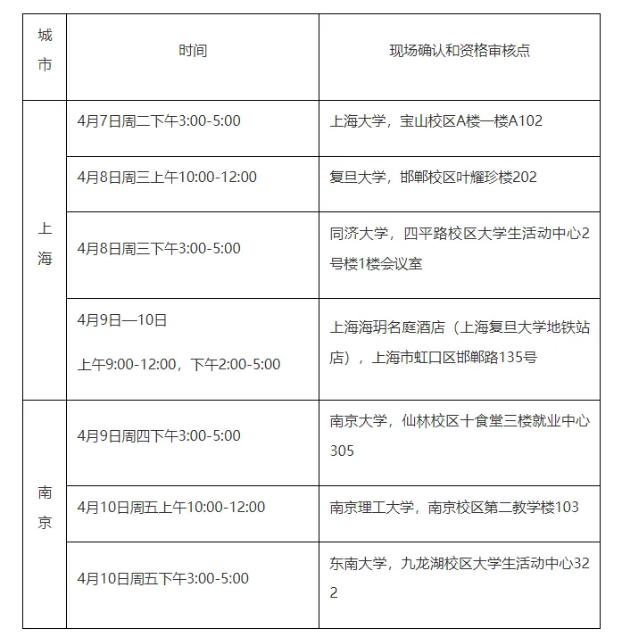 本次招聘将在复旦大学、同济大学、上海大学、南京大学、东南大学、南京理工大学等高校举行系列宣讲活动,宣讲会接受考生现场报名、现场确认和资格审核。高校宣讲时间和地点如下: