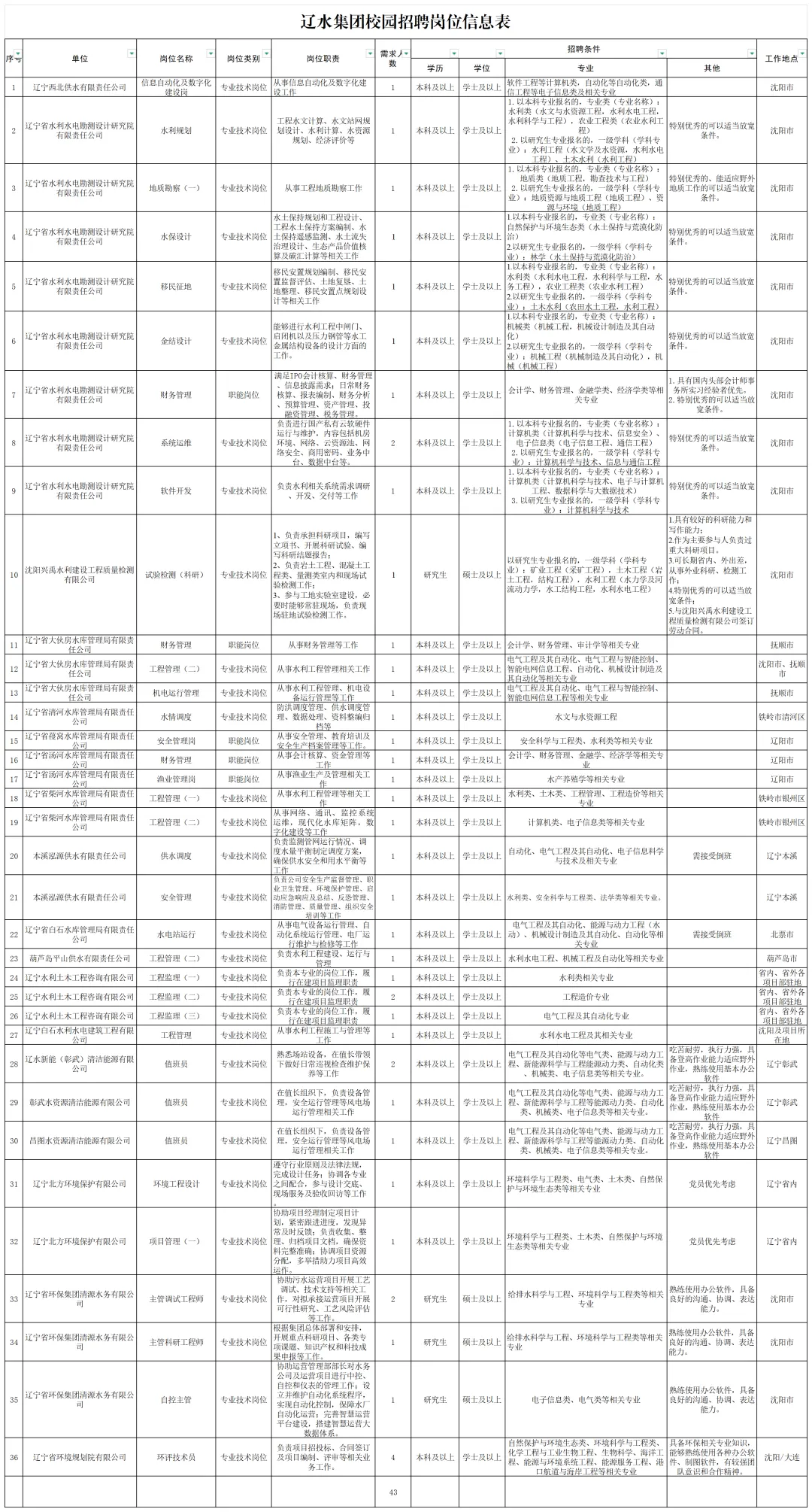 2.政治立场坚定,拥护中国共产党领导,具有良好的政治素养;3.身体健康,具备适应岗位要求的身体条件和心理素质;4.具有良好的道德品行,有较强的事业心和责任感,热爱水利、生态环保事业。3.具有良好的沟通协调、持续学习能力和团队协作精神;本次招聘共43人,具体岗位及要求详见《辽水集团校园招聘岗位信息表》(附件1)。1.报名时间:即日起至2026年4月17日17时。2.报名方式:线上报名,应聘人员在指定地址投递简历:szyjtOCR2025-2026-02.zhiye.com。请如实填写个人相关信息,将《辽水集团校园招聘报名与考评表》(附件2)、学籍备案、各阶段成绩单、获奖证书等报名材料,一并上传至指定地址,每人限报一个岗位。此前已参加本次校园招聘第一批报名但未录用的人员,若有意应聘本次补录岗位,须重新在本次补录公告指定报名渠道提交简历,原报名信息不再有效。(二)资格审查。辽水集团根据岗位招聘条件对应聘人员提交的材料进行资格审查和岗位匹配性筛选。资格审查贯穿招聘全过程,在任何环节发现不符合条件者,取消其应聘资格。通过资格审查和岗位匹配性筛选的人员将通过电话或短信等方式通知进行笔试,未通过者不另行通知。1.笔试内容: 根据各岗位任职要求进行通用能力测试。3.笔试时间:预计5月上旬在沈阳市进行现场笔试,具体时间、地点将以短信形式发送至入选人员手机,请收到短信人员务必按照短信提示时间回复是否参加笔试,未回复短信者,招聘项目组会以电话进行沟通确保收到相关信息,若未能接通者,视为放弃笔试机会。(四)面试。对资格审查和岗位匹配性筛选通过人员,进行面试。1.面试形式:半结构化面试,部分岗位同时面试专业试题。2.面试人数:根据笔试成绩从高到低,拟按招聘计划不高于1:3的比例确定面试入围人员名单(如果笔试成绩相同,则同时进入面试环节)。3.面试时间:预计5月中旬在沈阳市进行现场面试,具体时间、地点、面试形式将以短信形式发送至入选人员手机,请收到短信人员务必按照短信提示时间回复是否参加面试,未回复短信者,招聘项目组会以电话进行沟通确保收到相关信息,若未能接通者,视为放弃面试机会。根据面试成绩确定考察人选。考察通过确定为拟聘用人选,与用人单位签订就业协议。(六)体检。拟聘用人选毕业后,用人单位统一组织拟聘用人员到指定体检机构进行体检,标准参照公务员录用体检标准执行,体检费用自理。体检不合格者或放弃体检者,不予聘用。(七)聘用与备案。对拟聘用人员在辽宁省国资委网站进行公示,公示期为5个工作日。公示期满后,如无反映意见或反映意见经调查核实证明不属实或不影响使用的,与用人单位依法签订《劳动合同》,并约定试用期。辽水集团为聘用的员工提供具有竞争力的薪酬待遇,全额缴纳五险一金。员工享受法定假期、年休假、定期体检、节日关怀、员工食堂等福利待遇。(一)应聘人员应确保报名信息真实有效,如存在错填、漏填等影响正常招聘的行为,集团有权取消应聘者报名资格;如存在个人信息造假等不诚信行为,将纳入集团招聘诚信黑名单,报名截止后一年内不再接收其报名、应聘;(二)集团有权根据岗位需求变化及报名情况等因素,调整、取消或终止个别岗位的招聘工作;(三)本次校园招聘不收取任何费用,不指定考试辅导用书,不举办也不委托任何机构举办考试辅导培训班;(四)本次校园招聘信息均以辽宁省国资委网站和辽宁国资公众号公布信息为准,请应聘者留意信息更新。应聘人员应保持所留联系方式畅通有效,如因应聘人员通信不畅而引起的信息传递问题,由应聘人员本人负责;(五)咨询电话:021-61948899,接受咨询的时间为招聘期间工作日9:00-11:30,13:00-17:00;(六)其他未尽事宜按有关文件规定执行。本公告最终解释权归辽宁省水资源管理和生态环保产业集团有限责任公司所有。附件: