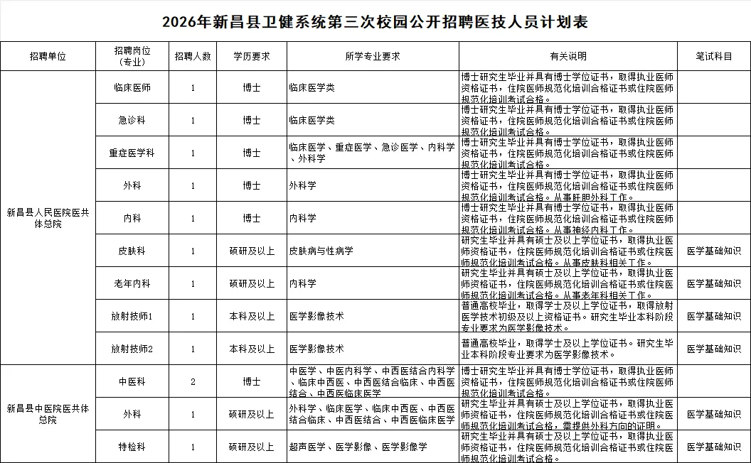 2026年我县卫健系统第三次校园公开招聘计划招聘医技人员13名。具体招聘单位、岗位、人数和报考资格条件,详见《2026年新昌县卫健系统第三次校园公开招聘医技人员计划表》(附件1)。