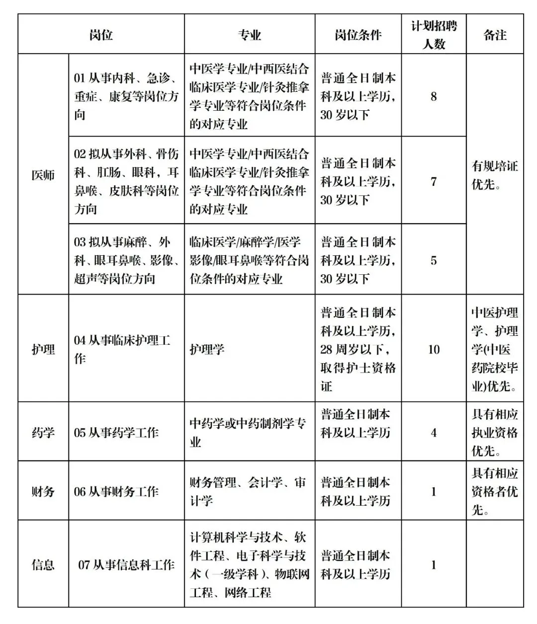 1、具有中华人民共和国国籍,拥护中国共产党的领导,遵守宪法和法律;2、遵纪守法,品行端正,有较强的团队意识和协作精神;3、具有良好的职业道德和行为规范,热爱卫生健康事业;5、医疗专业30岁以下;护理、药学、财务、信息28岁以下;中级职称中医类别医疗专业年龄适当放宽;在本区内医疗机构在职人员,需征得原单位书面同意;6、研究生免笔试,录取及考核通过后给予分期学费补贴3万元;招聘计划及条件一览表