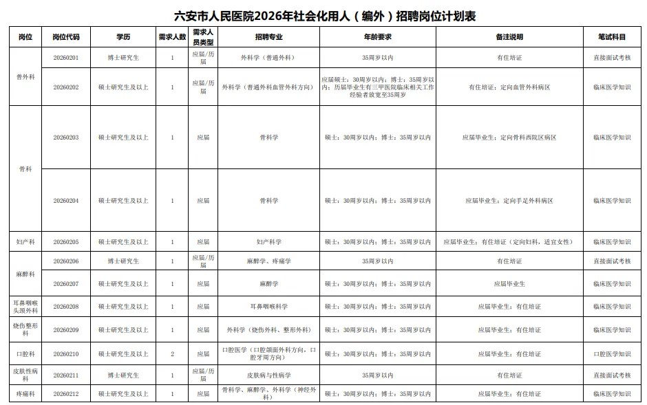笔试和面试由六安市人民医院组织实施,具体时间及安排另行通知。考生不按规定时间、地点参加考试的,视为自动放弃。考试过程中如有违反招聘纪律的报考人员,视情节轻重按有关规定分别给予取消考试资格、宣布考试成绩无效、取消招聘资格等处理。
