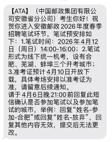 (中国邮政集团有限公司安徽省分公司)考生你好!祝贺你进入安徽邮政2026年度春季招聘笔试环节,笔试预安排如下: