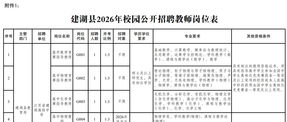 招聘岗位及条件等详见《建湖县2026年校园公开招聘教师岗位表》(以下简称《岗位表》,附件1)。