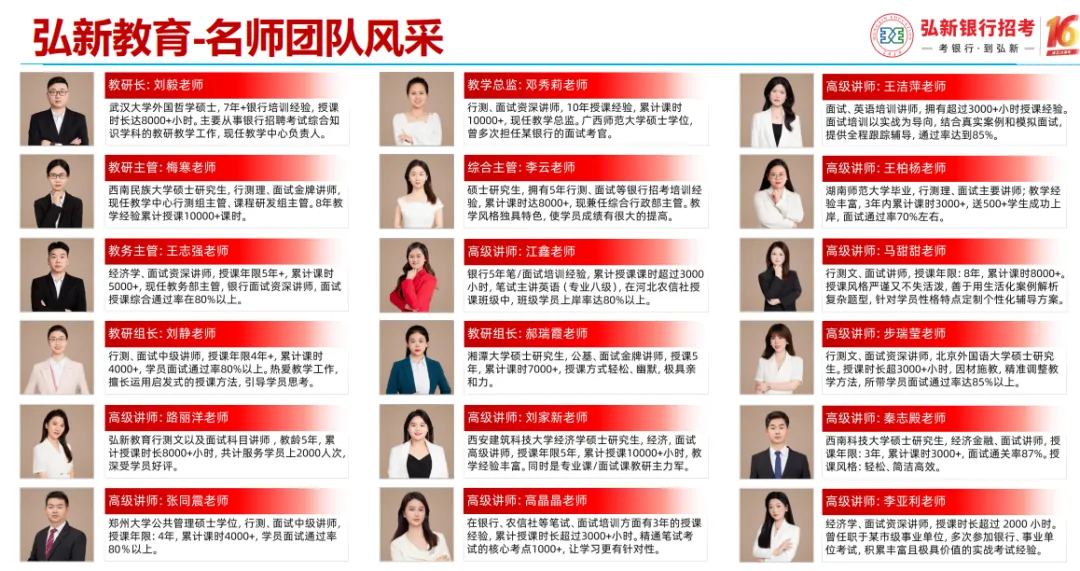 汇集了银行系统、邮政系统、农信社系统、各类资格 证、国企央企招考等考试每个科目、每个环节的高水平师资,并在考试方向、课程体系、授课方式等 研发方面不断创新。